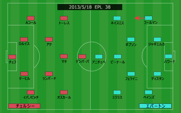 先週ベンフィカとのヨーロッパリーグを制したチェルシーは、セントラルに18歳のアケを先発させ、トーレスを右サイドハーフに置くという布陣で挑んだ。対するエバートンはフェライニをセントラルに置き、ピーナールをトップ下、ネイスミスを右サイドで先発させた。
