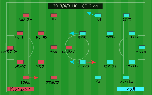 Sベンダーと替わった以外は同じ4-2-3-1で臨んだドルトムントに対しマラガは4-2-3-1から4-4-2へシステムチェンジ。