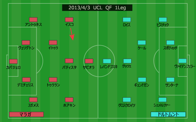 今日の試合でもドルトムントの中盤のロイス、ゲッツェ、ギュンドガンの3人とマラガのイスコ、バティスタ、ホアキンの3人が共に組立の役割を担い拮抗した状態が続いた。